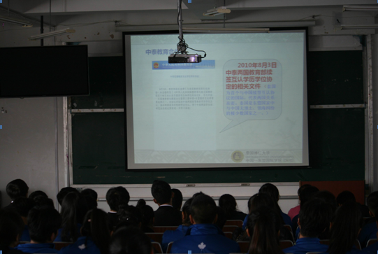 为了促进中国与泰国高校间的文化交流,加强两国间教育合作,2014年11月19日中午12:00,泰国高校代表来访我院,在一号教学楼三楼西多媒体召开了泰国留学和泰国文化交流讲座,为学院国际教育与交流项目又添上浓厚的一笔。