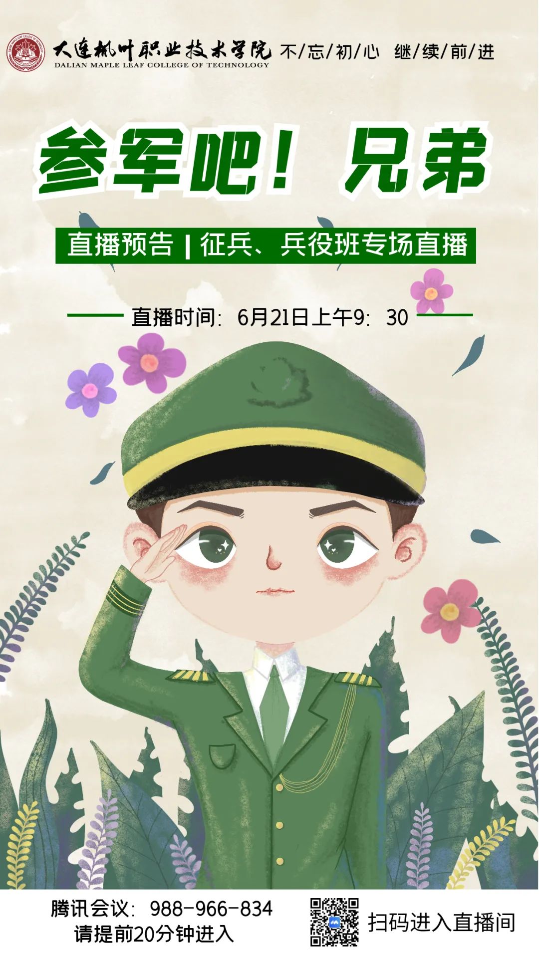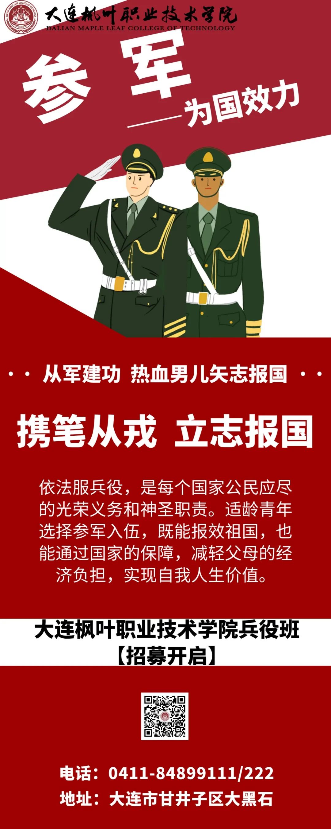 大连枫叶职业技术学院征兵工作站,期待广大的枫叶学子,携笔从戎,报效祖国。