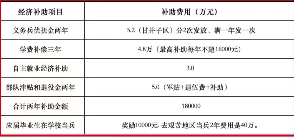 响应国家号召投笔从戎,服义务兵役2年,可以享受学费补偿等以下资助政策。合计金额不低于18万元。