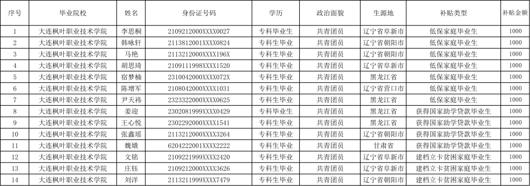 大连枫叶职业技术学院2021届大连市高校毕业生求职创业补贴公示