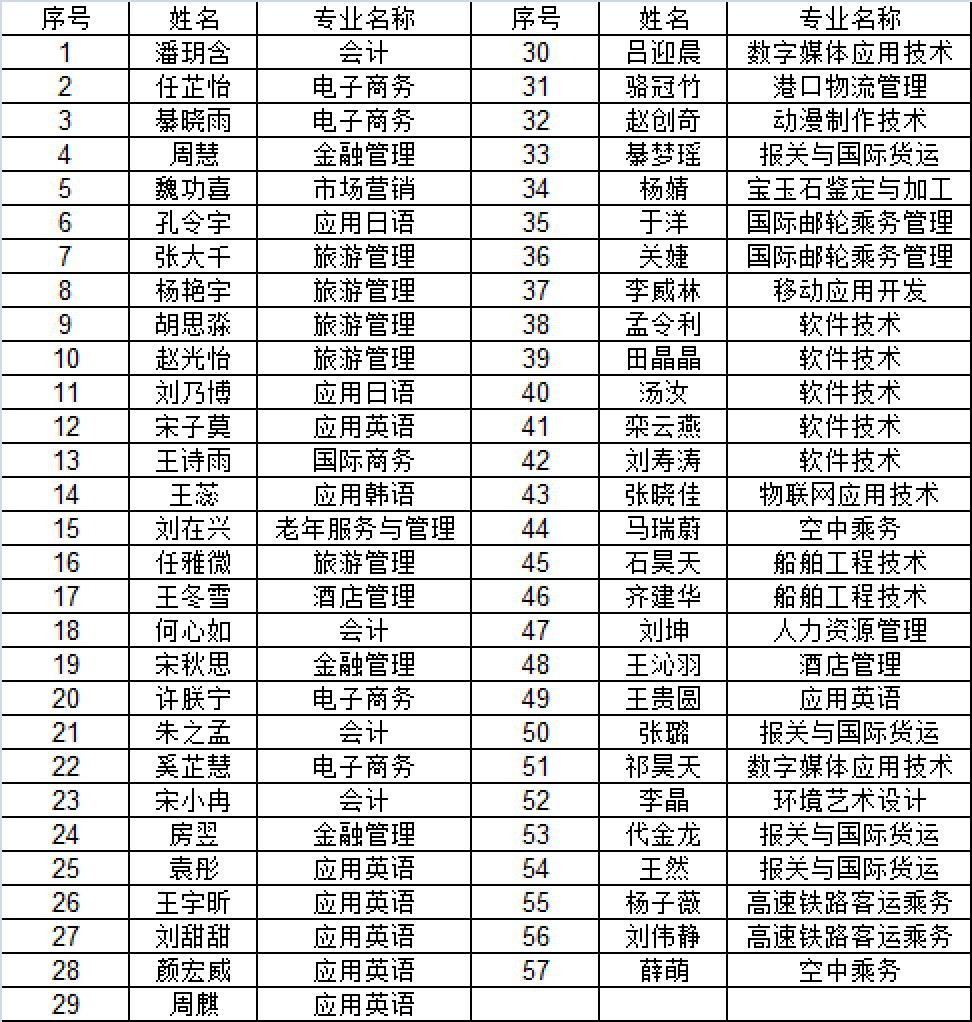 学校2021年预计毕业生(高职)共1876人,经公开遴选、院系上报、学院审核、公示等程序,共推荐省优秀毕业生57人,现将名单公示如下: