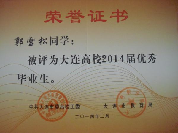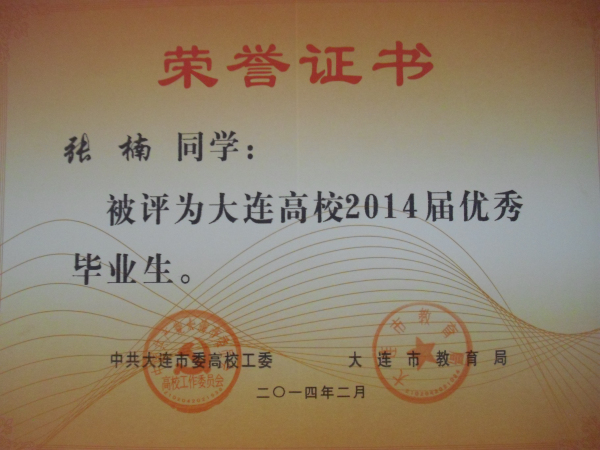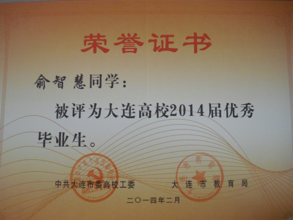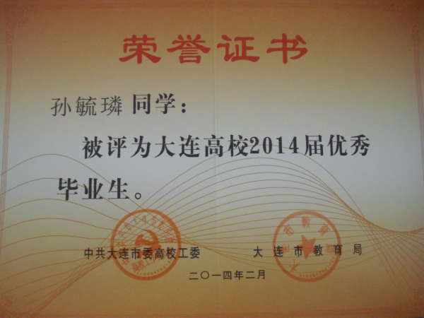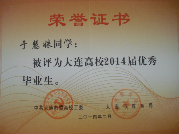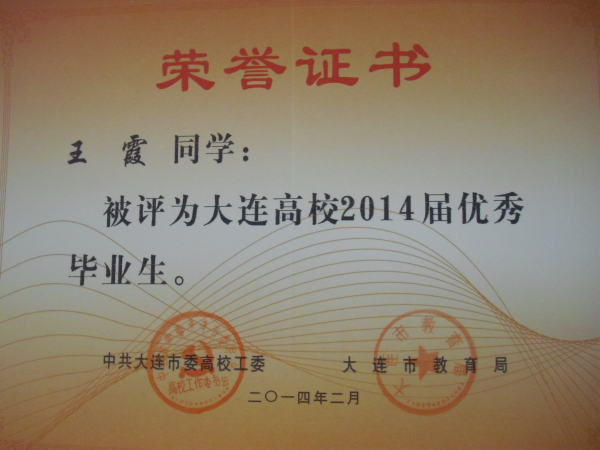 我院报关与国际货运专业王霞、孙毓璘,市场营销专业张楠、港口物流管理专业 俞智慧、动漫设计与制作专业 于慧姝、国际邮轮乘务专业 郭雪松同学被评为大连高校2014届优秀毕业生,在此向获此殊荣的同学表示祝贺!希望全体同学以他们为榜样,刻苦学习,勤奋努力,严格要求自己,为社会的发展贡献自己的力量!愿他们在今后的职业生涯中再创佳绩!