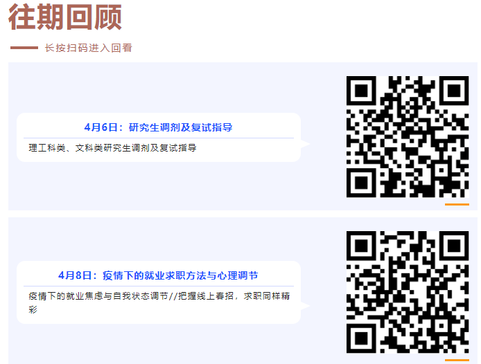 目前,正值2022届高校毕业生求职关键期。疫情突如其来,各位同学在求职路上放慢了脚步,虽是如此,但这段宝贵的时光,也能让各位同学更加认真地总结过去的得失、思考自己的未来、拓宽自己的视野、规划自己的职业。为此,这期间,我们设计了“同心战疫,就在云端—就业指导专题活动”,邀请专家从考研复试、就业观念、就业心理、求职礼仪、就业政策等方面为大家指路领航、加油助力。