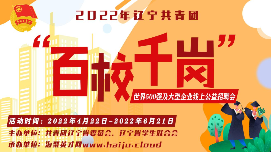 为深入贯彻习近平总书记关于人才工作的重要论述,全面落实中央、省委人才工作会议精神,积极响应引导与支持优秀青年人才“留辽就业”的政策方针,由共青团辽宁省委员会、辽宁省学生联合会共同主办的2022年“百校千岗”就业服务季——世界500强及大型企业线上公益招聘会将于4月22日正式开启!本次招聘会依托海聚英才平台,以世界500强及大型企业为主导,联合中小微企业提供覆盖智能制造、金融财经、信息技术、教育培训以及电子商务等热门领域的优质高薪岗位,全面助力疫情防控期间企业的复工复产与青年人才的高质量就业。