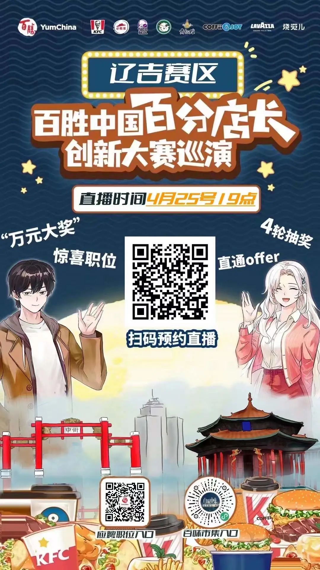 百胜餐饮集团(肯德基、必胜客母公司)于本月25日下周一19:00举办空中宣讲,希望学生们积极参加观看直播,可以直接应聘也可以拿到offer直通车;直播过程中有抽奖环节同学们有机会得到百胜餐饮的专属定制礼品;有创意想法的学生还可参加百胜全国校园挑战赛: