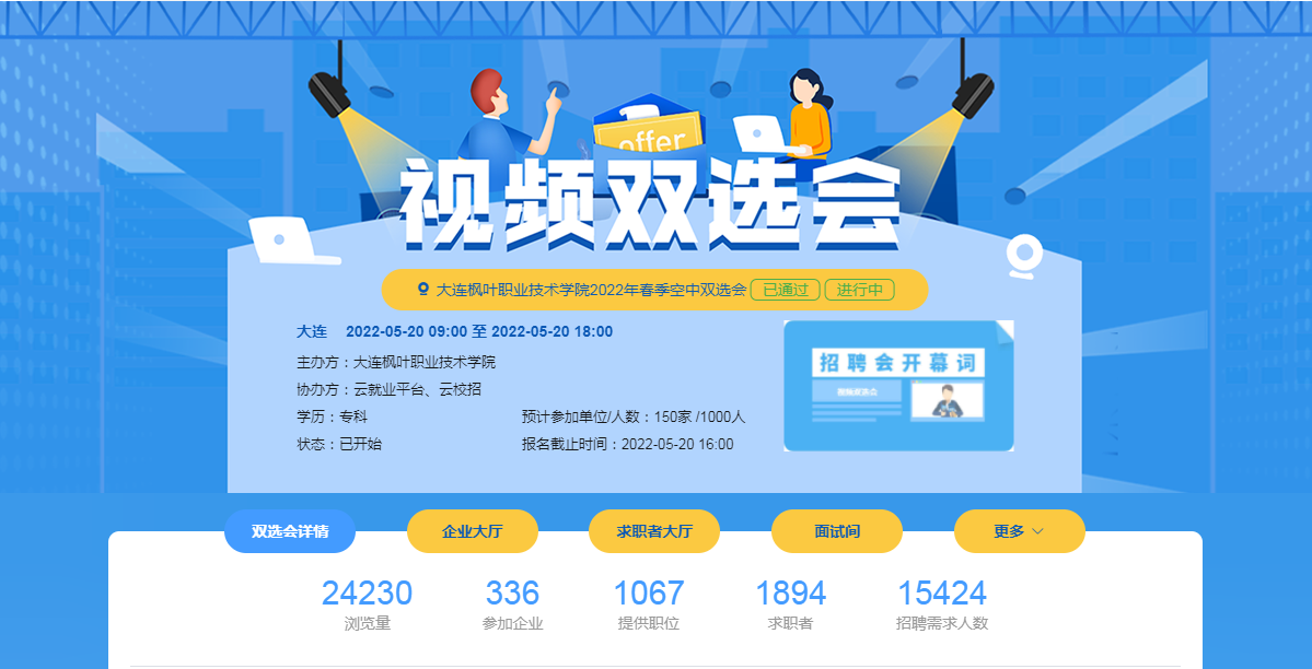 空中双选,云聚人才。学院结合实际情况,切实做好2022届毕业生、2023届顶岗实习学生的就业、实习推荐工作,落实全省2022届高校毕业生就业工作电视电话会议精神,于2022年5月20日举办大连枫叶职业技术学院2022年春季空中双选会。