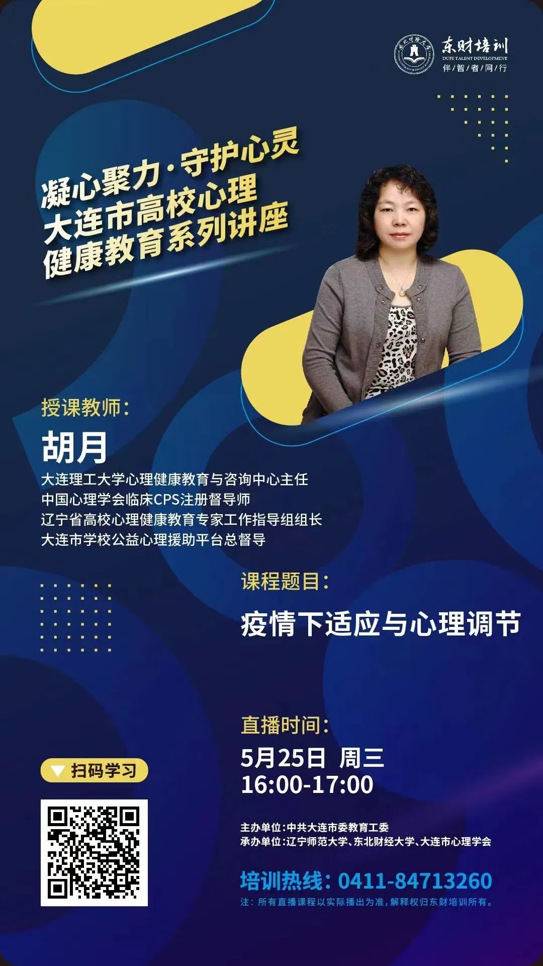 【授 课 人】胡月,教授,博士生导师,大连理工大学心理健康教育与咨询中心主任,清华大学访问学者,中国心理学会临床CPS注册督导师,教育部平安留学心理服务专家,教育部高校辅导员培训及研修基地授课专家,中国团体咨询与团体治疗专业委员会常委,中国大学生心理咨询专业委员会常委,中国社会心理学会心理健康专业委员会常委,辽宁省高校心理健康教育专家工作指导组组长,大连市学校公益心理援助平台总督导。