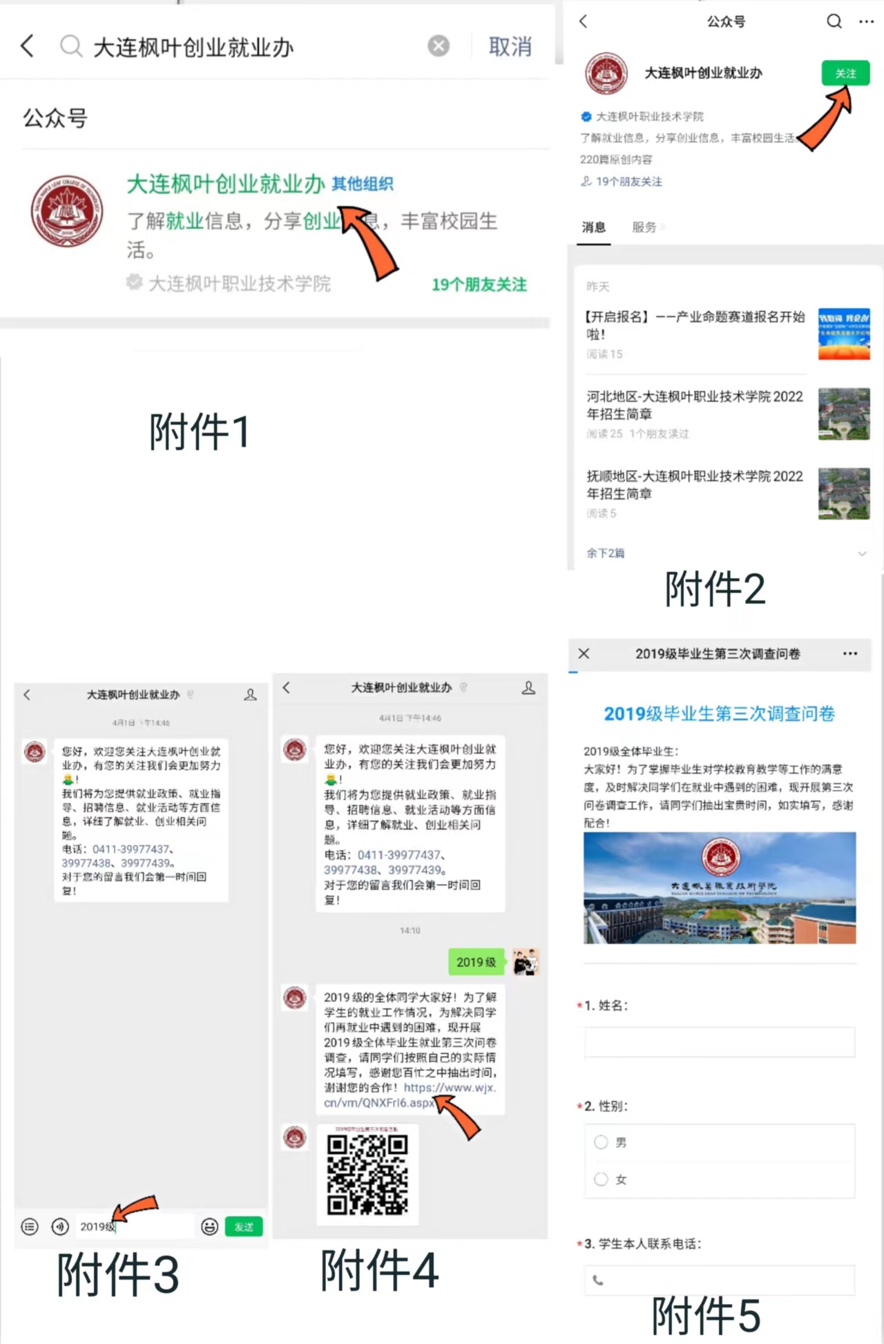 1.搜索“大连枫叶创业就业办”,关注“大连枫叶创业就业办”微信公众号;见附件1和附件2。