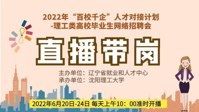 为深入贯彻落实党中央、国务院关于“稳就业”“保就业”决策部署,切实做好“百校千企”人才对接计划的组织实施工作,辽宁省就业和人才服务中心联合省内部分高校开展不同类别的直播带岗活动,以网络招聘为基础推动“百校千企”人才对接计划,祝各位同学顺利就业。