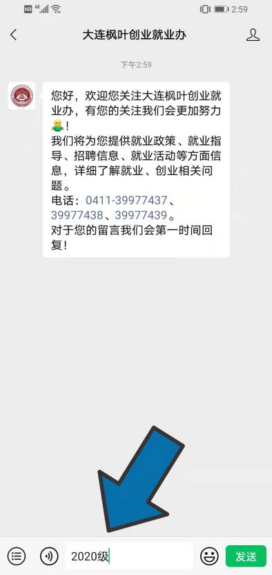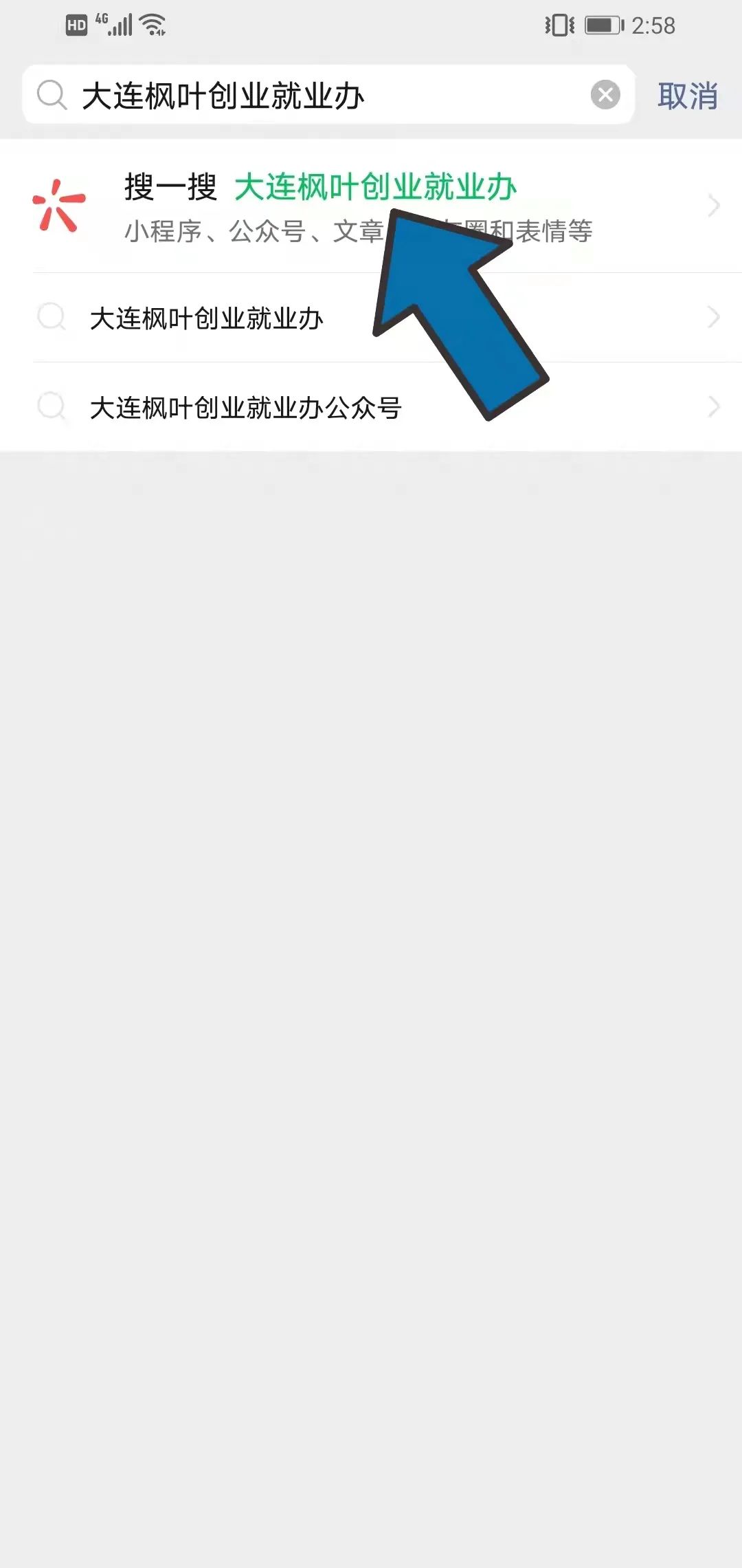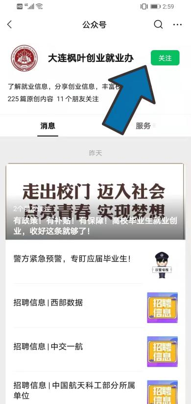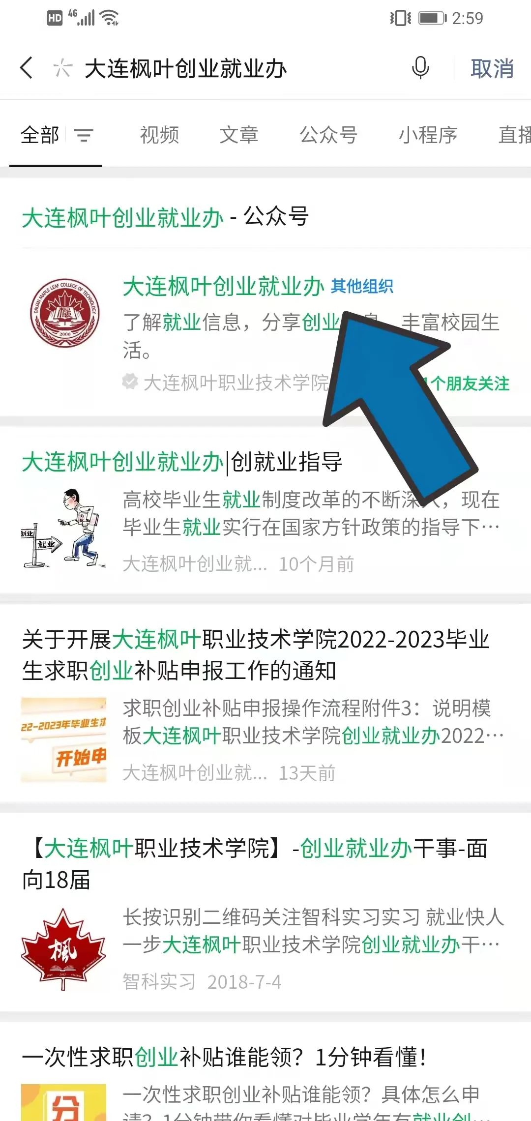 1.搜索“大连枫叶创业就业办”微信公众号,并关注;