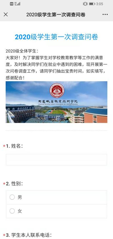 为了做好2020级学生实习及后续就业服务,及时了解学生实习情况,跟踪、预测及解决同学们可能会面临的难题,现开展2020级学生第一次问卷调查工作。请各位同学抽出宝贵时间,根据自身情况如实填写,感谢同学们的配合!
