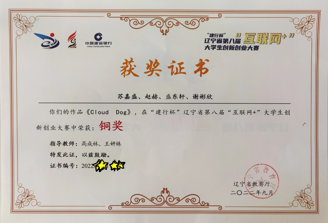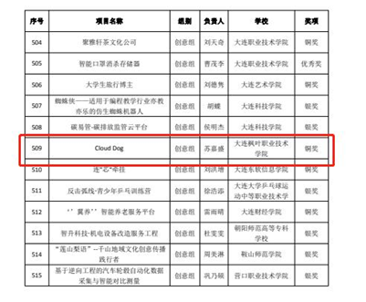 近日,辽宁省举办“建行杯”辽宁省第八届“互联网+”大学生创新创业大赛的结果已公示,大赛主题为:我敢闯,我会创。在大连枫叶职业技术学院教师高成林、王妍姝的指导下,学生苏嘉盛、赵赫、盛东轩、谢彬欣创意设计的《Cloud Dog》项目在职教赛道创意组荣获铜奖。