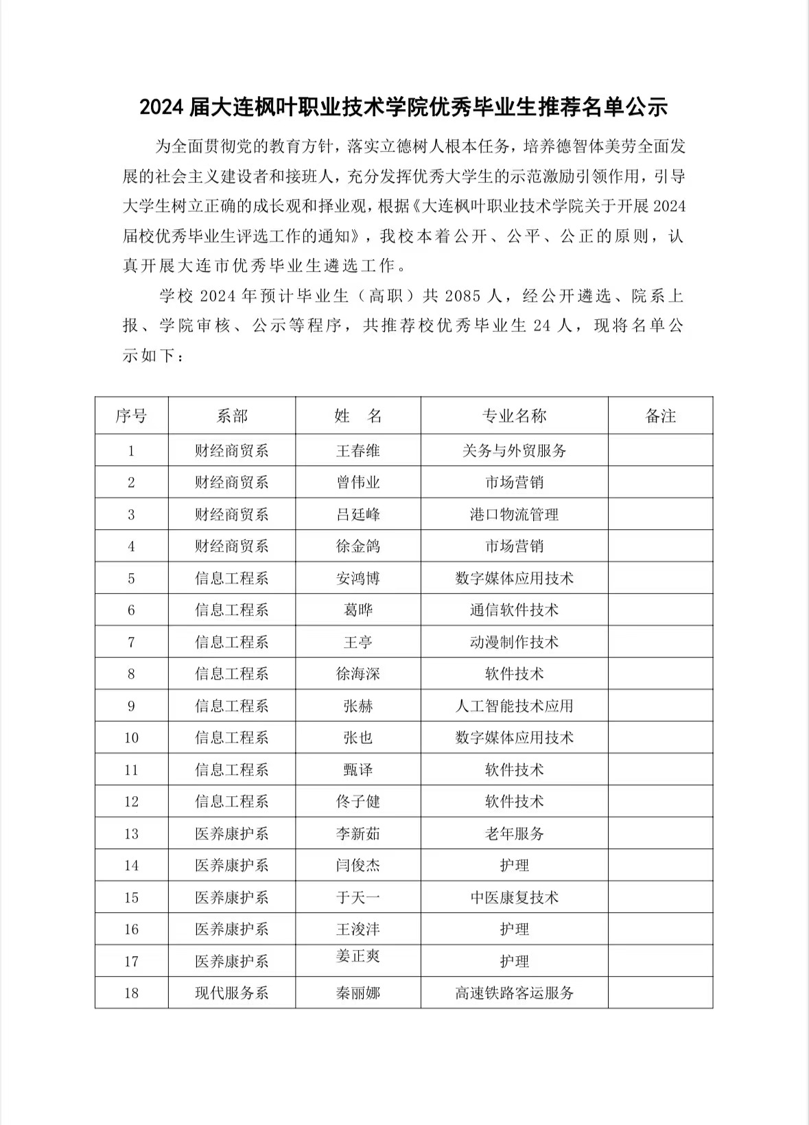 【通知】|2024届大连枫叶职业技术学院优秀毕业生推荐名单公示