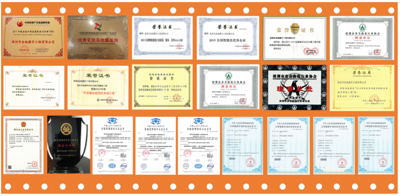 公司具备电子与智能化专业承包一级资质、建筑智能化系统设计专项甲级资质、安全技术防范系统设计、施工、维修一级资质、特种设备安装维修许可证A级资质、信息系统集成及服务三级资质。先后获得“中国房地产供应商服务力品牌TOP5”、“全国智能化优秀企业”、“全国智能建筑行业质量、服务、信誉AAA企业称号”、“中国智慧城市建设推荐品牌”、“平安城市建设优秀工程商奖”、“智慧城市建设优秀工程商”、“优秀安防系统集成商”、“最具社会责任感企业奖”等多项荣誉称号,当选深圳市安全防范行业协会理事单位、智慧安防行业协会副会长单位。