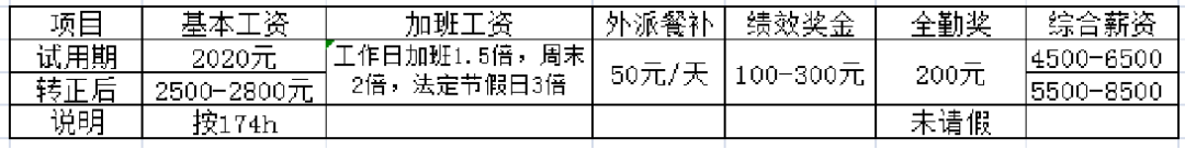 应发工资=基本工资+加班工资+外派餐补+绩效奖金+全勤奖,其标准见下表: