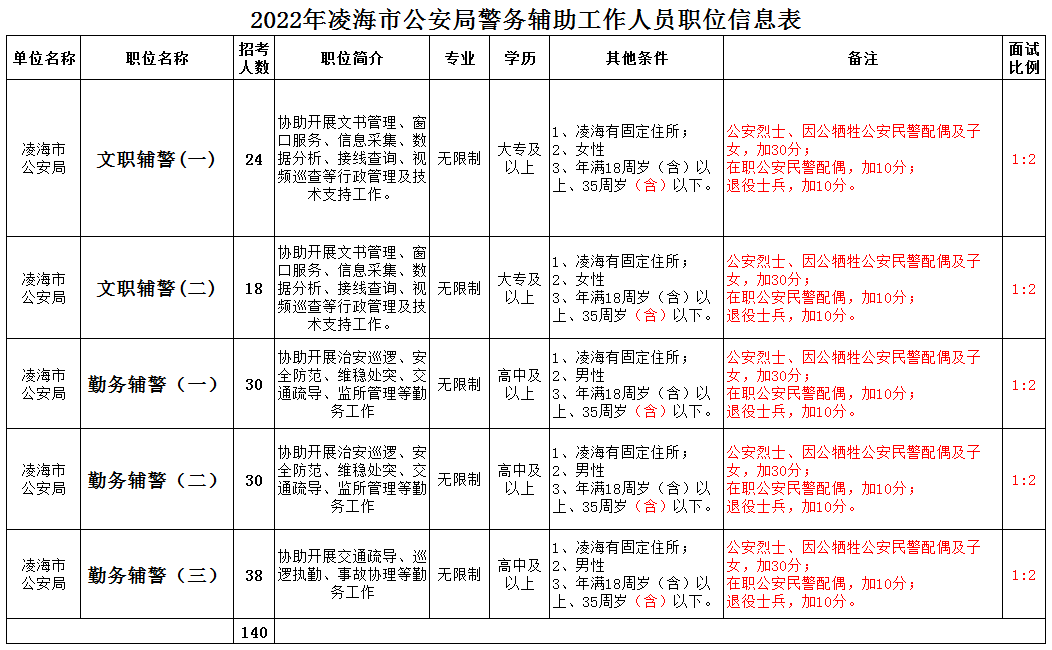 招聘警务辅助人员140名,其中男性98名,女性42名,具体岗位详见附表(见文中最下方)。招聘到的辅警,身份性质不属于公务员、不属于参照公务员法管理单位工作人员、不属于事业编工作人员,与公安局委托的第三方劳务派遣公司签订劳动合同。工作岗位为凌海市公安局警种大队及派出所。公安工作性质特殊,报考人员需能适应倒班、夜班执勤等工作安排,到岗后需能服从岗位分配。