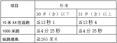 3.体能测试。报考法警岗位的人员需要参加体能测评,项目为10米×4往返跑、1000米跑、纵跳摸高(采取准入制),达到标准视为合格,有一项不达标者,视为体测不合格。参加体能测评人员须着运动鞋;严禁患有心脑血管及其他不宜参加体能测评疾病的人员参加体能测试,出现后果由本人负责,标准如下: